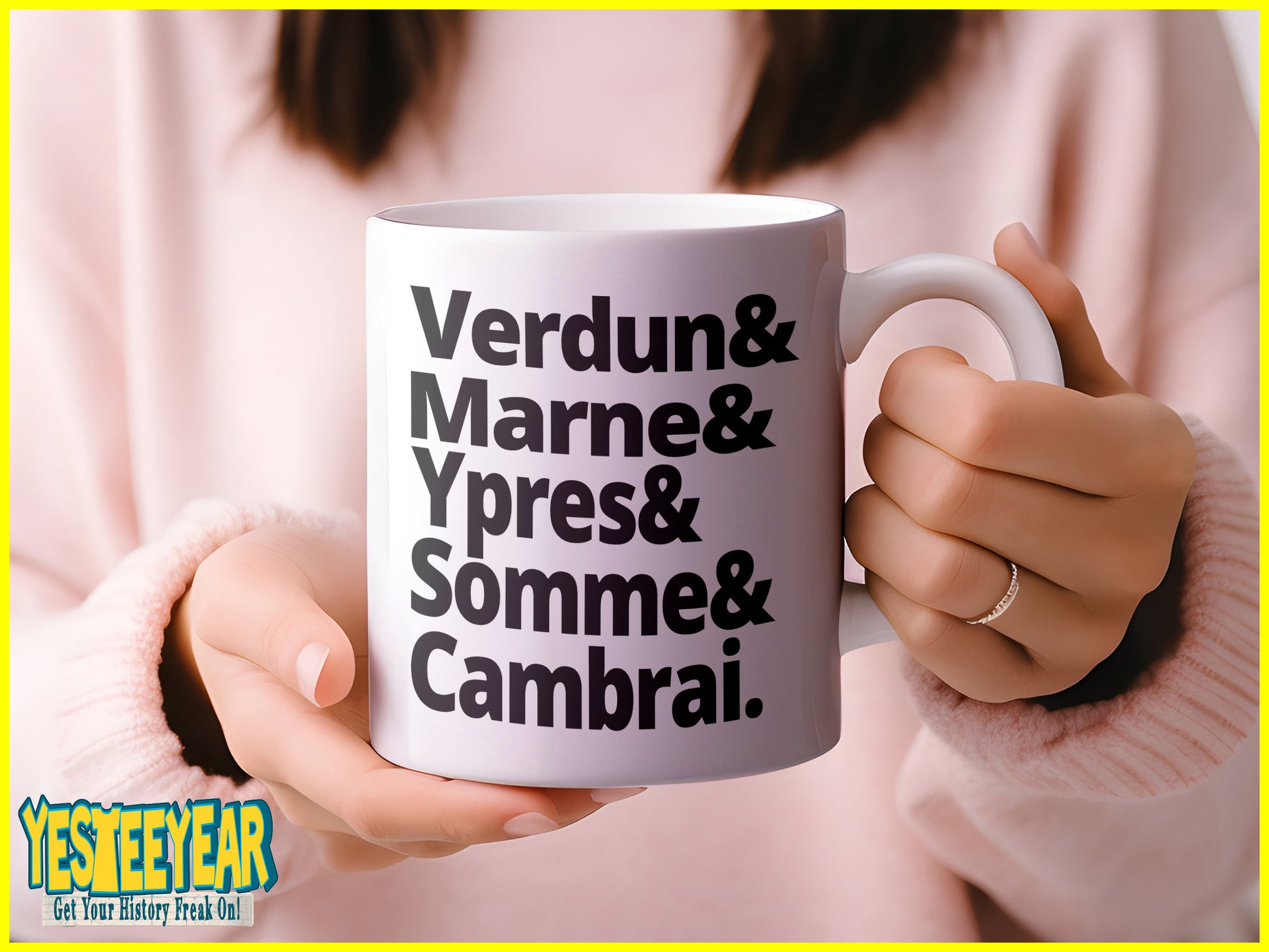 The battles at Verdun, Marne, Ypres, Somme, and Cambrai were some of the most important conflicts during the First World War in Europe. Remember the brave soldiers that fought these battles with this history mug.