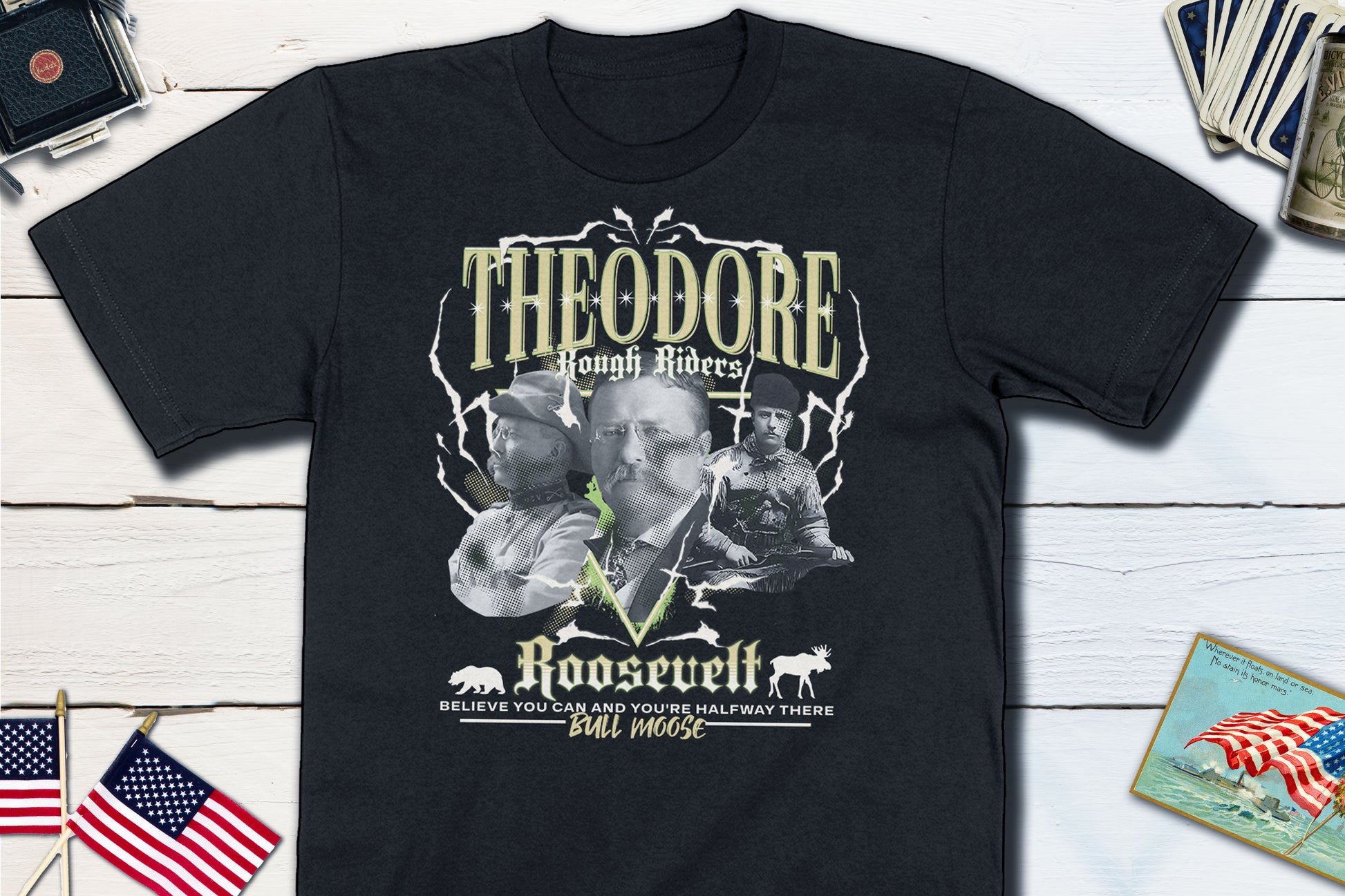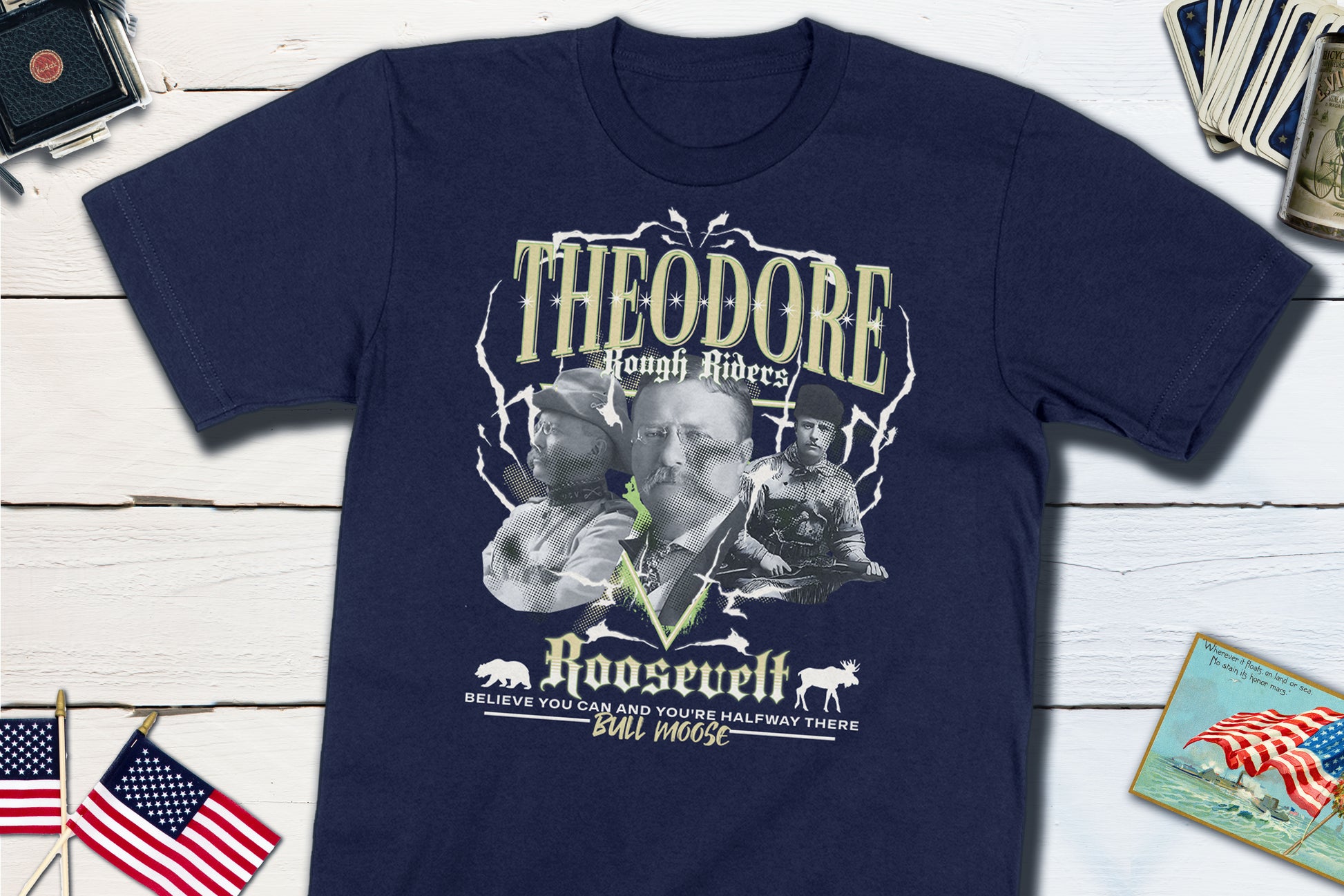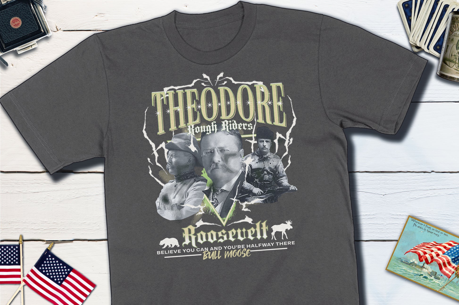 Rock your next concert with this bootleg tee with a vintage flair. Retro Bootleg design for the original Bull Moose, US President Theodore Roosevelt.